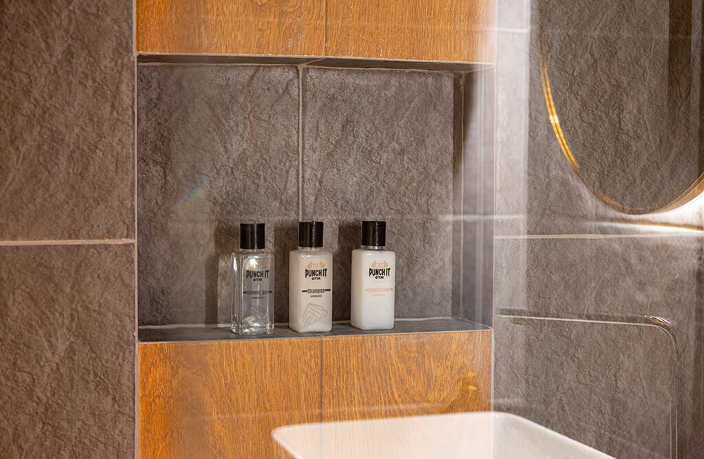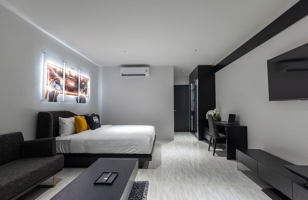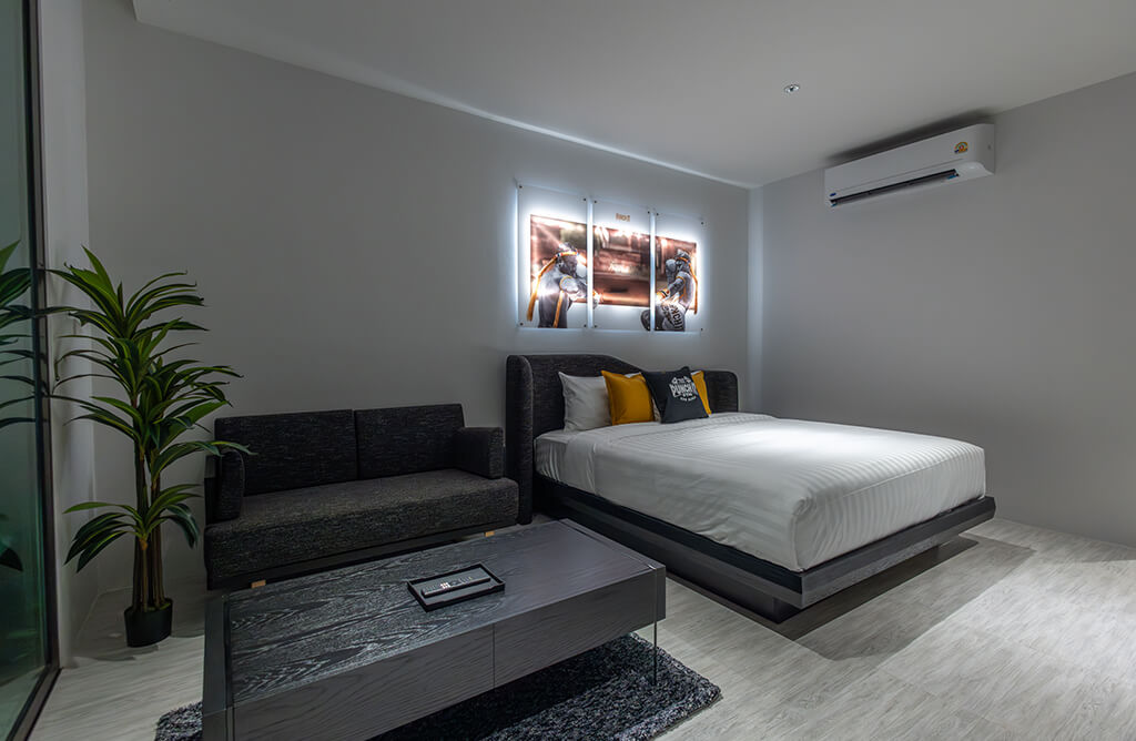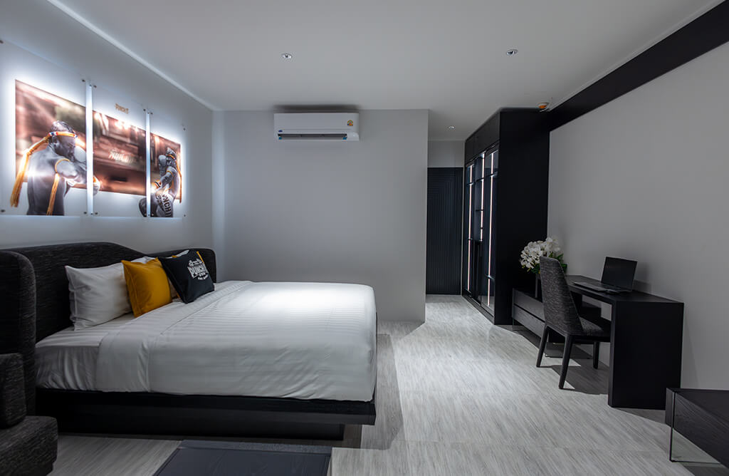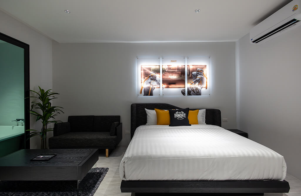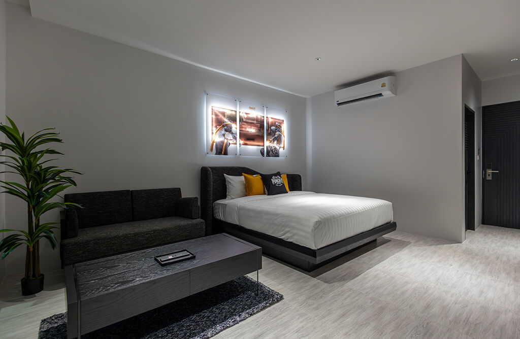 Punch it Fighter Room, a smartly designed 35 m² space located directly next to our Punch it Muay Thai Gym and Punch it Healthy Café in Lamai. Perfectly blending functionality, comfort, and accessibility, this room is ideal for guests who want to train hard, rest well, and stay connected — all within walking distance to the gym and beach.