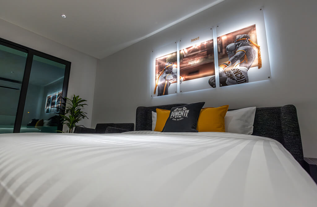 A step above staying in a Muay Thai camp, this luxury accommodation directly overlooks Lamai beach and offers one of the most beautiful sea views in Samui. The 48 m2 room provides the perfect place to relax after a tough Muay Thai workout. Located just 900 metres from Punch it Gym, it is easily accessible by scooter. For those who do not feel comfortable on a motorbike, we will organise transportation to and from the gym for all training sessions free of charge.